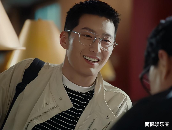 清爽的发型和穿搭,配上一副框架眼镜,一笑起来眼睛眯起,露出洁白整齐的牙齿,格外耀眼。